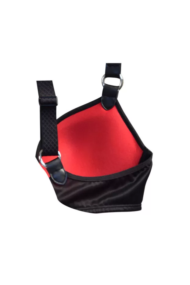Ce soutien-gorge est le symbole même de la Femme Fatale avec ses bretelles aux anneaux métalliques. Le chatoiement du cuir appelle au toucher et la couleur rouge profond de l’intérieur du bonnet réveillera votre force intérieure. Ce soutien-gorge à la forme extensible s’adapte parfaitement à tout type de poitrines. La lanière passant délicatement sous la poitrine et la couvrant légérement, donne une touche très sexy.