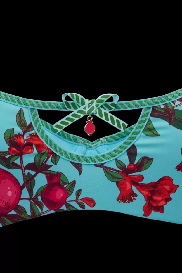 Ce demi-soutien-gorge sexy a des bonnets basses qui pourraient montrer vos mamelons, selon la forme naturelle de vos seins. Les petits coussins à l’intérieur du soutien-gorge donnent à vos seins un lifting subtil. Le résultat: un décolleté super sexy. Le tissu avec un imprimé numérique Allover de grenades est posé sur une base de soutien-gorge turquoise, créant un effet de trou de serrure ludique. Ce soutien-gorge durable est fabriqué de tissu recyclé, et en imprimant numériquement, nous économisons 50 à 60 litres d’eau par mètre de tissu. La touche finale: un petit arc et un pendentif de grenade au centre de votre décolleté.