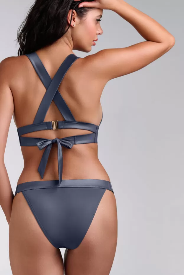 Ce haut de bikini de bralette a un fit extrêmement confortable sans sous-armature. Même sans sous-armatures, les tasses rembourrées et les bretelles audacieuses offrent beaucoup de soutien. Ce haut de bralette améliore la forme naturelle de vos seins. Il est fabriqué à partir de tissu recyclé dans une couleur gris en acier. Un tissu brillant dans un ton assorti est ajouté dans les endroits parfaits pour créer une forme flatteuse. Les détails de couleur or ajoutent une touche de finition luxueuse.