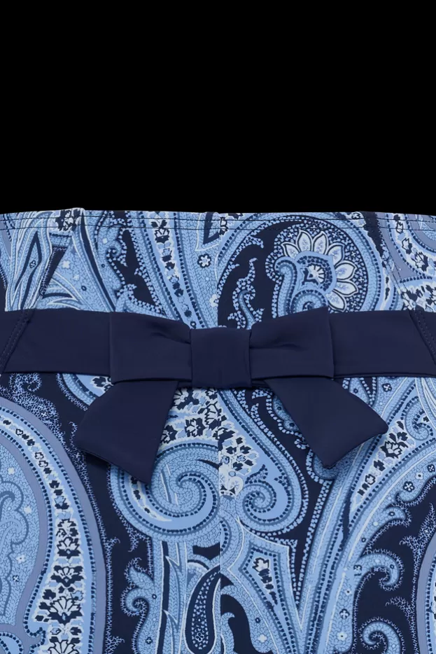 Ces slips de bikini à taille haute créent une magnifique silhouette de sablier. Ils rationalisent vos courbes en offrant une couverture confortable de vos fesses, de vos hanches et de votre ventre inférieur. Ces bas de bikini sont fabriqués à partir de tissu recyclé. Un joli motif paisley dans différentes nuances de bleu est imprimé sur le tissu numériquement. L’impression numérique est un moyen plus durable de colorer le tissu, ce qui permet d’économiser 50 à 60 litres d’eau par mètre de tissu. Une ceinture bleu foncé avec un joli arc dans le dos termine le design.